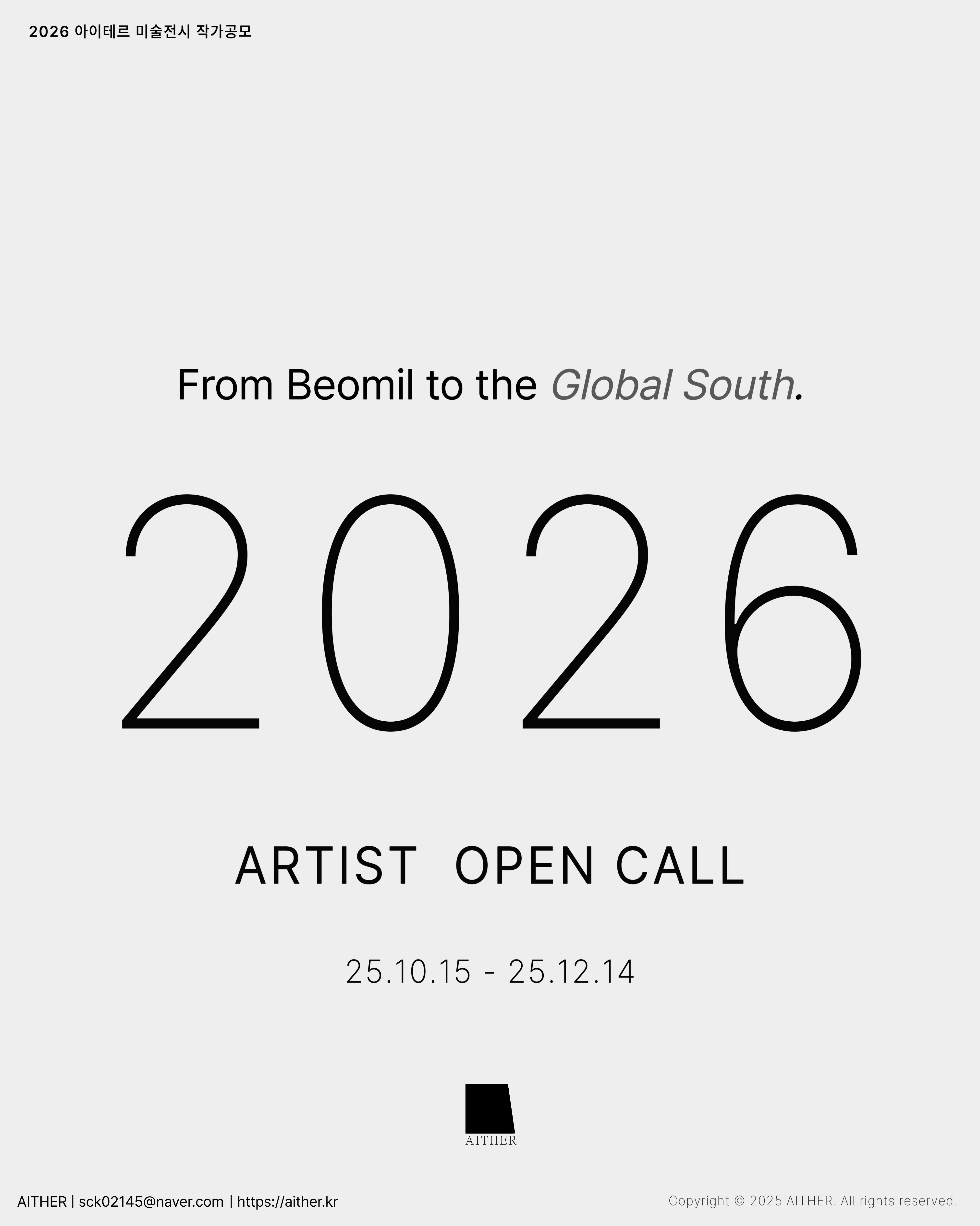 아이테르는 예술을 통해 세상의 폭을 넓힌다는 비전 아래, 글로벌 사우스에서 시사점을 제시할 수 있는 전시와 퍼포먼스를 활발히 운영하는 예술단체입니다. 2026년 전시 공모를 아래와 같이 진행하오니, 새로운 예술적 담론을 함께 만들어갈 작가들의 많은 관심과 참여를 바랍니다.
