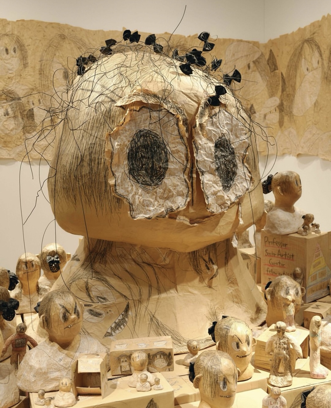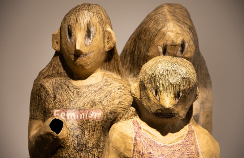 신민 작가의 ‘유주얼 서스펙트(유력한 용의자)’ 작업은 머리망을 쓰고 일하는 서비스직 여성 노동자의 현실을 다룬다. 음식점에서 고객의 민원이 제기되면 CCTV를 통해 ‘머리카락을 흘린 범인’을 찾아내는 현실을 꼬집은 작품이다. 이는 생계를 위해 프랜차이즈 패스트푸드점과 카페 등에서 일했던 작가 자신의 경험을 바탕으로 제작된 연작으로, 여성 서비스업 노동자를 향한 사회적 규범과 불평등을 특유의 과장되고 우스꽝스러운 조각을 통해 풍자한다.