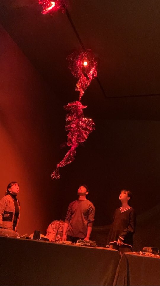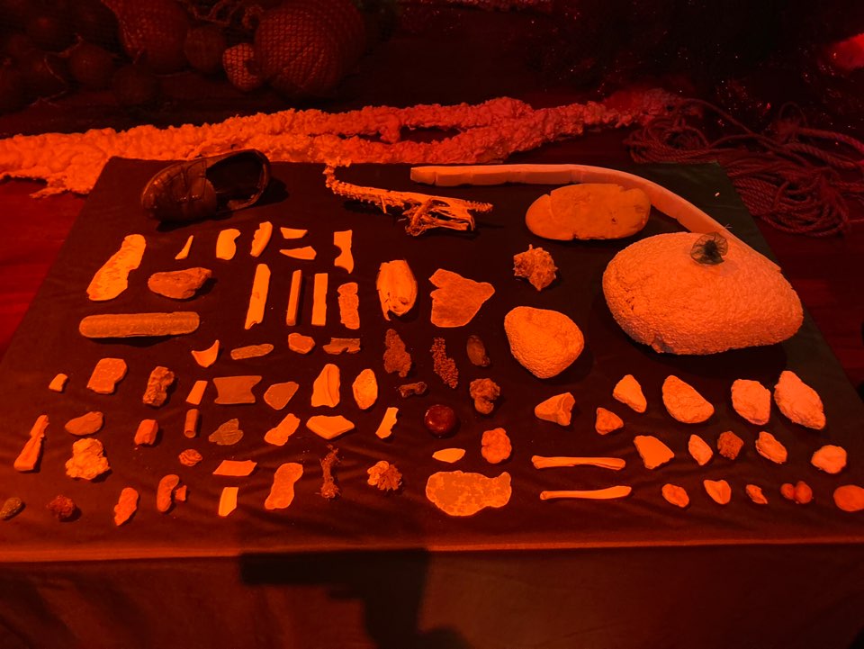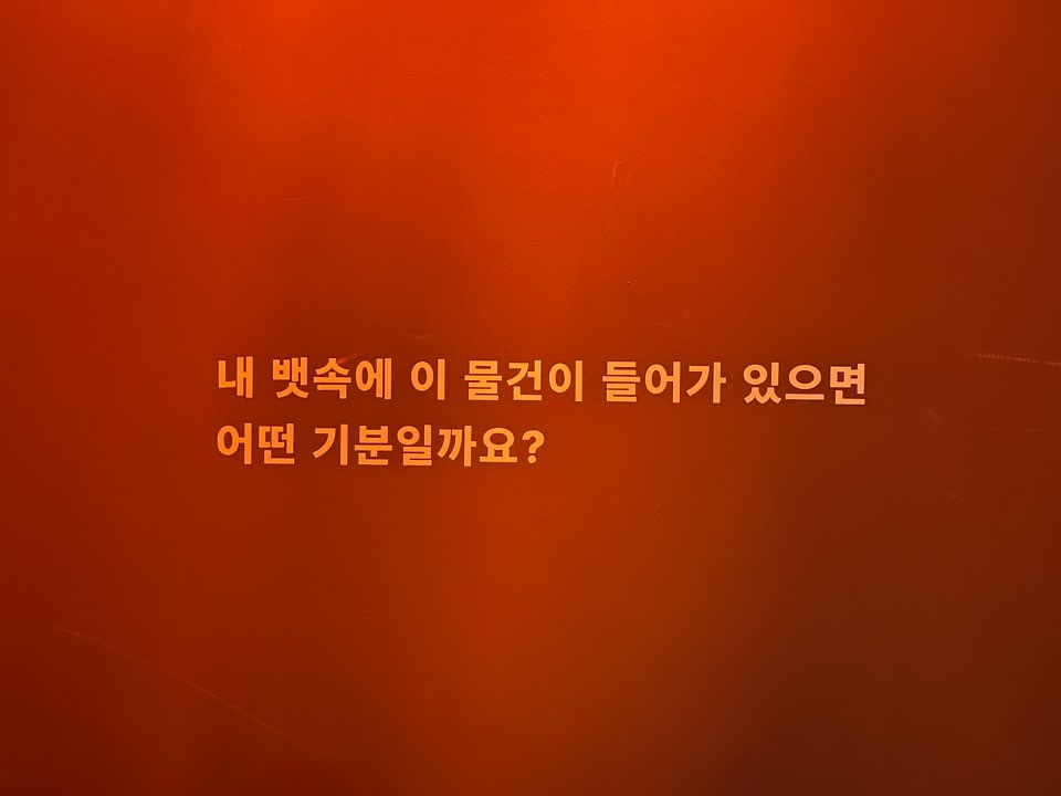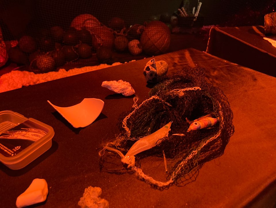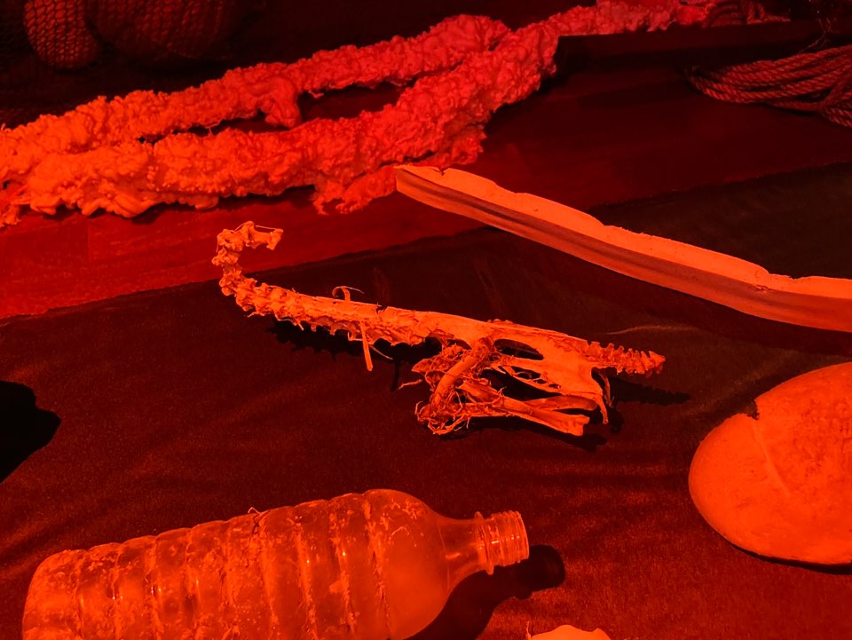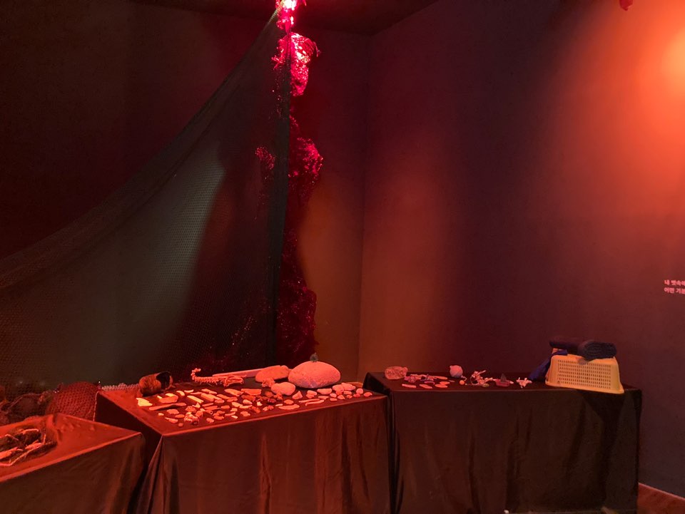 전시 공간의 핵심 컨셉 중 하나는 성경 속 요나의 이야기를 기반으로 한 고래 뱃속을 표현한 공간입니다. 이를 위해 붉은 셀로판을 활용하여 고래의 내부를 상징적으로 재현하였고, 실제로 수거한 해양쓰레기를 디스플레이 요소로 추가하여 해양 환경 문제에 대한 메시지를 담았습니다.