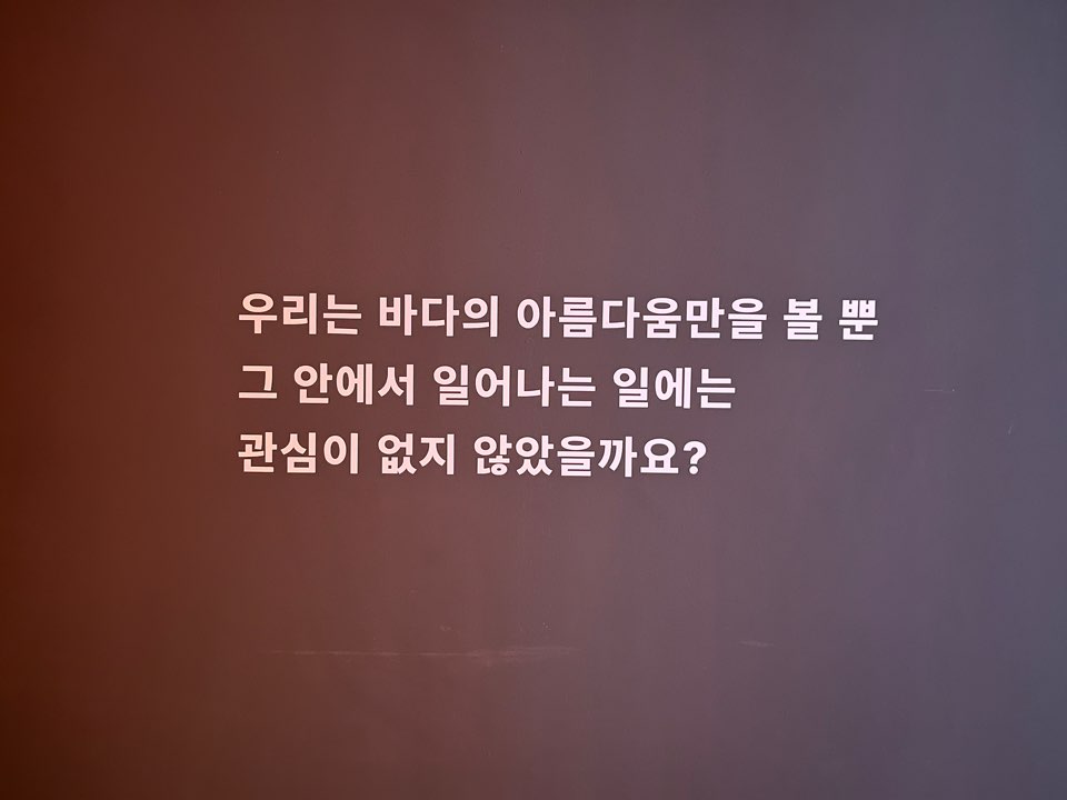 푸른 셀로판으로 구성된 벽면에 관람객이 하얀 펜으로 자신의 소감을 남길 수 있는 공간을 마련했습니다. 이 벽은 바다와 인간 사이의 상호작용을 반성적으로 경험하도록 유도하며, 자연과 인간의 연결 고리를 상징적으로 보여줍니다.