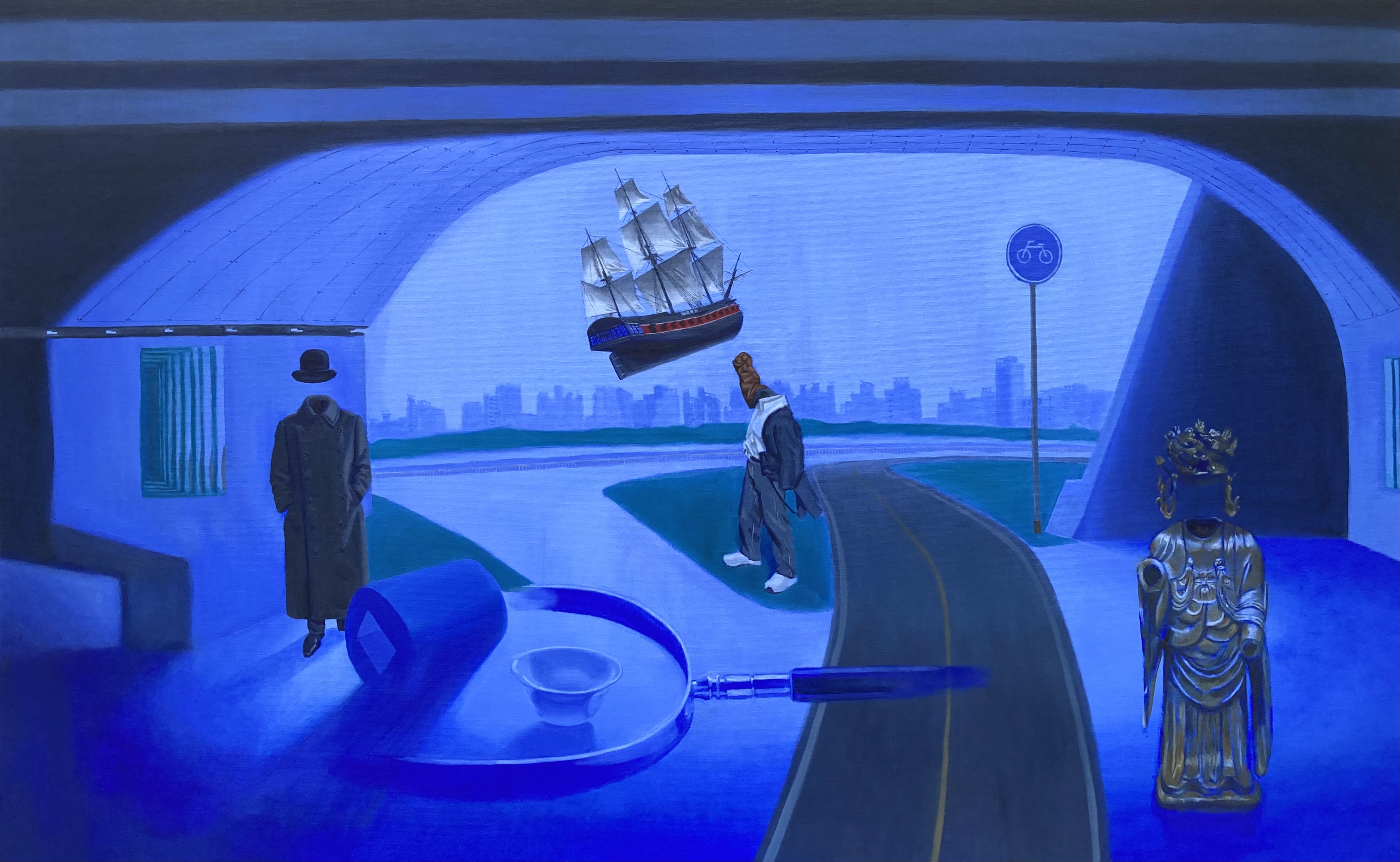 작업의 모티브는 앞서 언급했듯 겉모습만 보고 속은 보지않고 속을 알 수 없는 그릇된 시선과 그로인한 관계의 왜곡이다. 그 때문에 사람의 겉 껍데기(옷) 만을 그리고 그 속은 비우는 이미지로 표현한다. 그리고 왜곡된 시선으로 바라보아 형성되는 ‘관계’라는 의미로 거울이나 돋보기 같은 광학기기들, 완만한 도형이나 왜곡된 도형(불가능한 도형) 등을 화면상 등장시킨다. 나는 이것으로 관계에 대한 왜곡된 시선들을 은유적으로 표현한다.