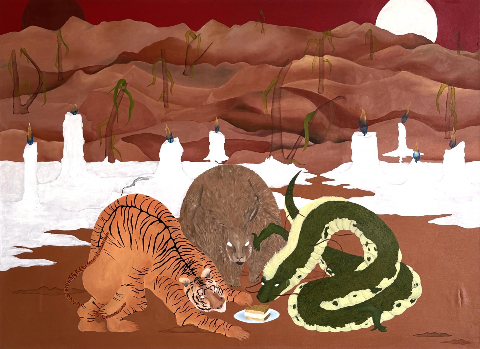 배경에 녹아내리는 초는 시간의 흐름과 함께 점점 동물들의 발을 잠식하며, 결국엔 움직임조차 제약하는 존재로 기능합니다. 이를 통해 시간의 유한함, 경쟁 속에서 오는 불안정한 감정 상태를 시각적으로 드러재고자 했습니다. 그러나 그런 상황 속에서도 동물들의 시선은 오직 케이크 한 조각에 집중되어 있으며, 이는 현재의 우리 사회가 가진 미련한 몰입과 집착을 은유적으로 보여주고 있습니다.