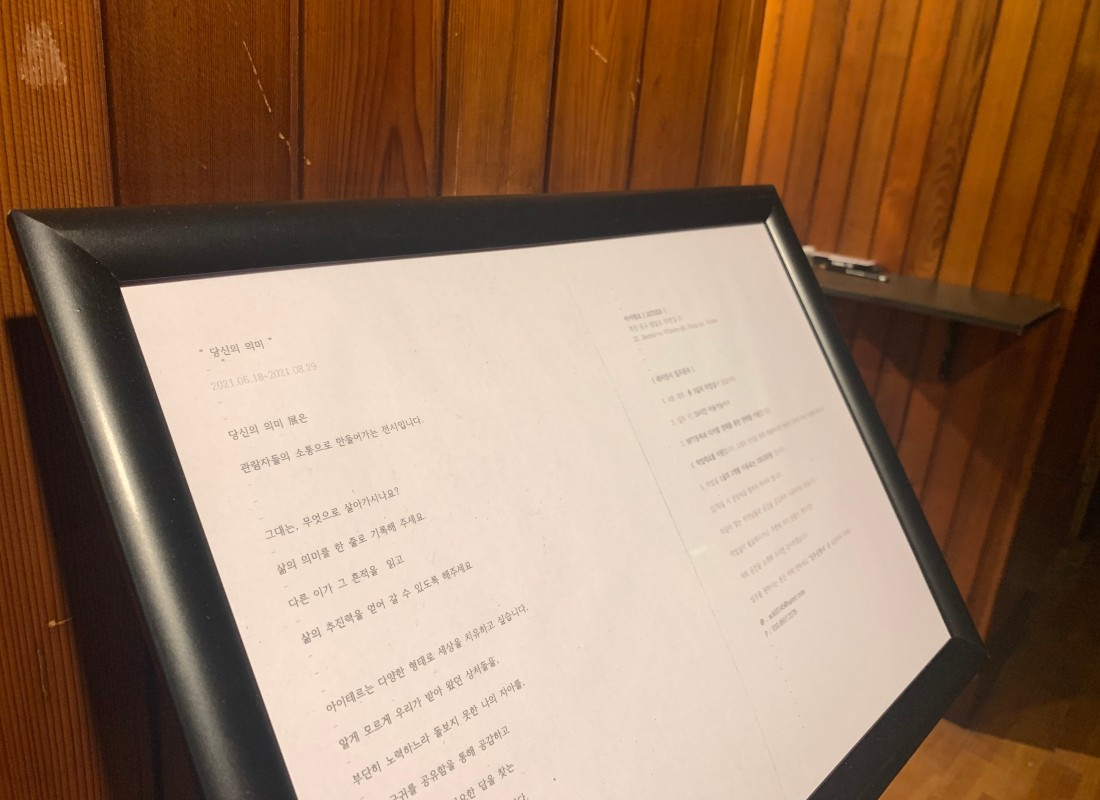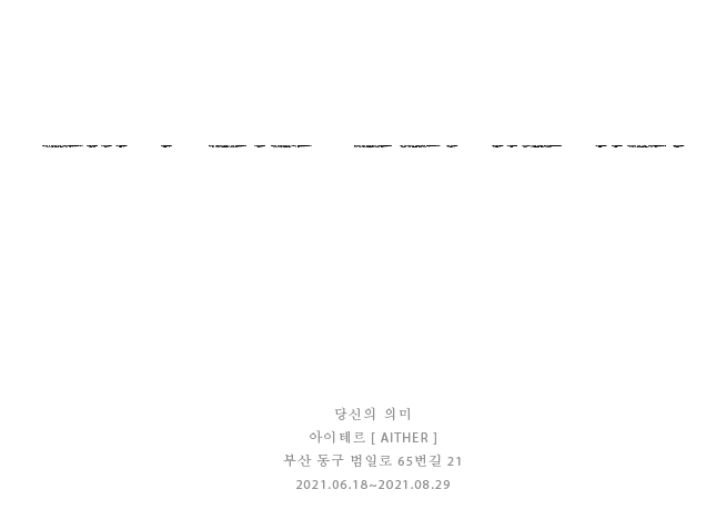 관람자들의 소통으로 만들어가는 전시입니다. - - - 그대는, 무엇으로 살아가시나요? - 삶의 의미를 한 줄로 기록해 주세요. - 다른 이가 그 흔적을 읽고 - 삶의 추진력을 얻어 갈 수 있도록 해주세요 - - - 아이테르는 다양한 형태로 세상을 치유하고 싶습니다. - 알게 모르게 우리가 받아 왔던 상처들을, - 부단히 노력하느라 돌보지 못한 나의 자아를, - 작은 글귀를 공유함을 통해 공감하고 - 스스로에게 가장 필요한 답을 찾는 - 의미 있는 기회가 되었으면 합니다. - - - - 감사합니다.