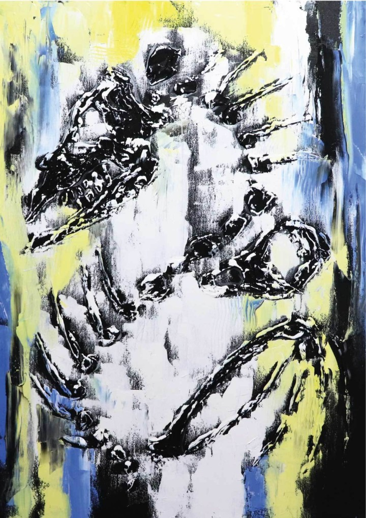 처음엔 무엇을 그릴지 몰랐다 . 그저 그래픽 디자이너로써 오랜 세월 컴퓨터와 씨름해오며 작업했던 내게 아날로그적인 감성이 필요했을 뿐이다 . 무엇을 그린다기보단 컴퓨터를 떠나고 싶었던 마음이 컸던 것 같다. 가만 생각해보면 입시할 때를 제외하곤 그동안 손으로 그림을 그린 날들이 드물었으니까. 그렇게 해서 시작하게 된 작업이 유화이다. 어려서 보았던 밥 로스 아저씨의 그 물감 섞는 모습을 추억하며 맨 처음 움켜쥔건 나이프였다 . 처음부터 붓에는 크게 끌리지 않았던 거 같다 . 거칠게 칠하는 나이프 페인팅에서 느껴지는 그 텍스처감, 그리고 팔레트에서 물감을 섞을 때의 꾸덕한 느낌에 매료되어 물감을 다시 만진다는 기쁨에 취해있었던 것이다 . 그렇게 가장 먼저 시작한 건 그저 그런 풍경화와 정물화였다. 그러다가 점점 나만의 정체성을 찾고 싶어졌는데 그때 전업으로 그림을 그릴 생각을 굳였던 거 같다. 그래서 발상하게 된 그림이 일명 화석을 모티브로 한 화석화 ' 이다 . 후에 이 그림들은 공통적으로 경계 經界 라는 이름을 붙이게 됐는데 그 이유는 화석에 담긴 의미에 기인한다. 먼저 화석을 떠올리게 된 계기부터 설명을 하자면 그것은 어느 날 그린 풍경화에서 시작했다. 여러 풍경을 그리던 도중 우연히 사막을 그리게 되었고 화려한 풀숲보다는 황량한 사막에 매력을 느끼게 되었는데 이유는 사막은 나에게 있어 하나의 추상적인 공간으로 다가왔고 그러한 혹독한 곳에서 생존하는 동물들을 보며 강인한 생명력을 느꼈기 때문이다 . 지금 생각해보면 내가 그러한 생명력에 매력을 느꼈던 건 늘 반복적으로 죽은 듯이 살아가는 나의 삶에 강인한 생동감이 필요했기 때문일지도 모르겠다. 그러다가 문득 나만의 방식으로 남들과는 다른 내 머릿속에 있는 어떠한 관념을 표현하고 싶어졌는데 그때부터 좀 더 진지하게 사막을 보며 고민을 했던 거 같다 . 사막의 풍경을 보자면 모래와 바위들이 연상됐으며 가끔 지나다니는 동물이나 말라버린 사체들의 뼈를 보자니 당연하게도 화석이 떠올랐다. 화석은 바위와 뼈로 주로 구성 돼 있기 때문에 사막의 축소판처럼 느껴졌던 것이다. 그리하여 나의 주제는 화석이 되었고 그곳에서 느껴지는 죽음과 그에 반대되는 동물들의 강인한 생명력을 떠올리며 생 生 과 사 死 의 공존이란 주제로 작품을 만들어갔다. 화석은 나의 이러한 관념을 잘 표현해 줬는데 화석은 죽어있는 하나의 바위지만 그것이 화석으로 남으면서 그들이 살아있었을 때의 흔적 역시 표현하기 때문이다 . 즉 삶과 죽음의 경계에 있다고 생각했다. 그래서 이때부터 난 작품들마다 경계라는 이름들을 붙이기로 마음먹었고 다른 이름은 생각해내지 못했다 . 처음엔 단순히 경계 뒤에 숫자를 붙이는 방식으로 그림들을 구별했으나 점차 이 방법이 감상자로 하여금 순서에 연연하게 만들 것이라는 걱정이 들면서 구별방식을 바꾸었다 . 바로 그림에 들어가는 색들의 이니셜을 나열하는 방식이다 . 그렇게 해서 나중에 나온 작품들은 경계 뒤에 알파벳들이 붙게 되었다. 처음에는 단지 화석을 그리는 데에 열중했으나 점차 그것은 그저 화석을 모방하는 것일 뿐 나만의 정체성을 표현하는 것은 아니라는 생각이 들면서 점차 뼈들의 형태를 분해하고 나열하면서 나만의 감성적 언어를 표현하려고 노력했다. 그래서 화석을 보면 얼핏 어떠한 동물의 화석 같긴 하지만 특정 동물을 뜻하진 않는다. 그것은 화석의 느낌을 들게 하는 어떠한 기호들일 뿐이다. 난 이것을 감정적 상형문자라고 표현하고 싶다 . 더불어 좀 더 화려한 색을 쓰기로 결심했는데 그러한 이유는 자연과 가깝게 지내는 인디언이나 기타 다른 부족들의 화려한 치장을 보면서 나 역시 아날로그 , 더 나아가서는 자연으로 회귀하고 싶다는 욕망이 들어서서다. 그래서 뼈대의 색이나 바위의 무늬를 연상케 하는 주변의 색을 원색적으로 바꾸었다.