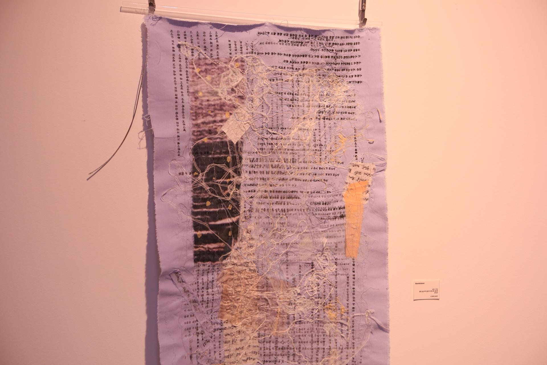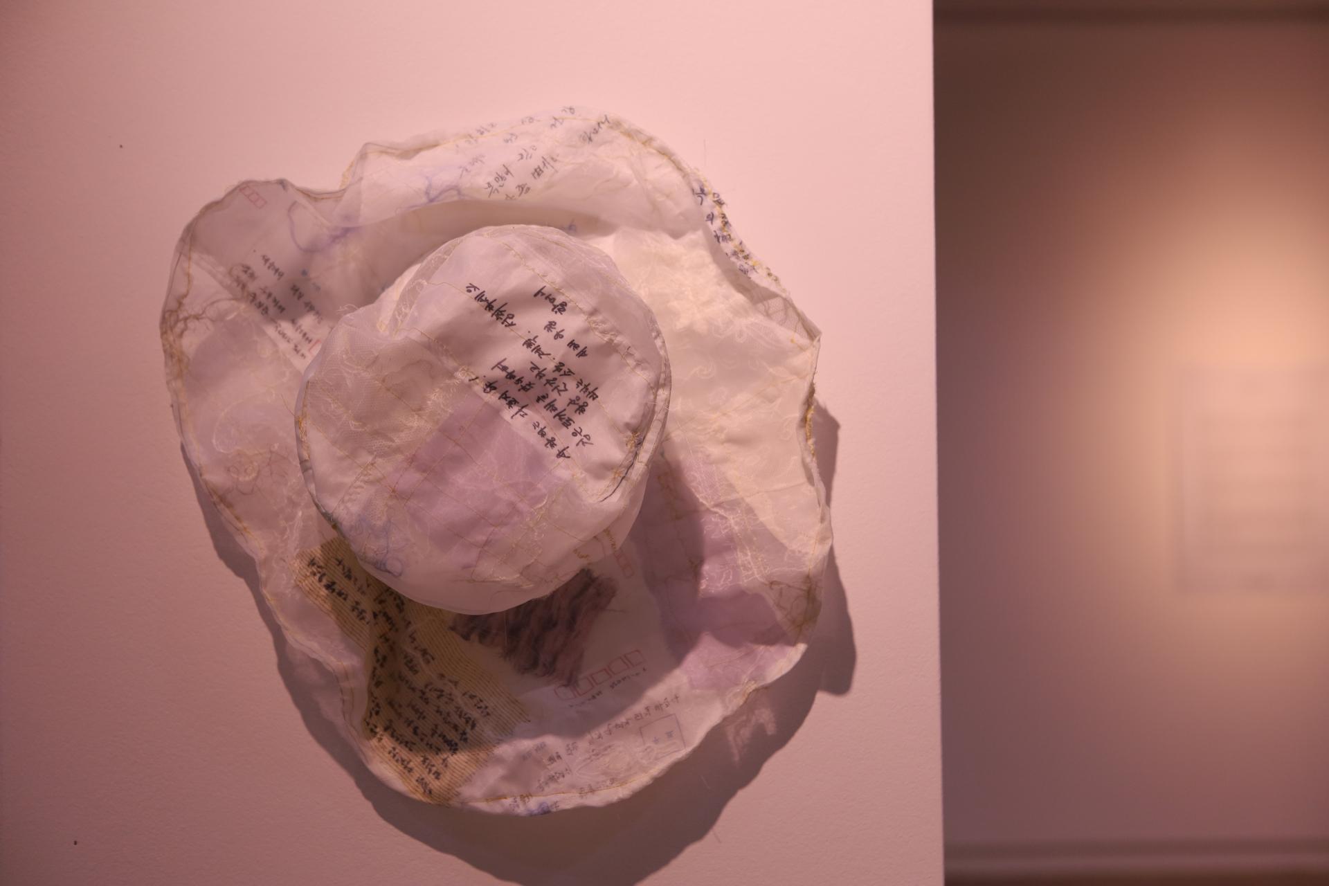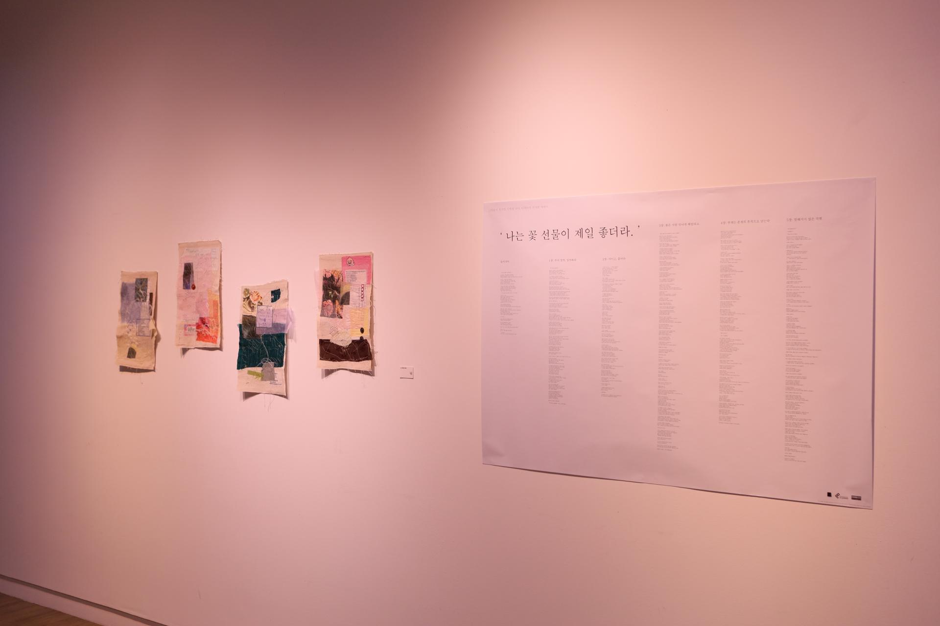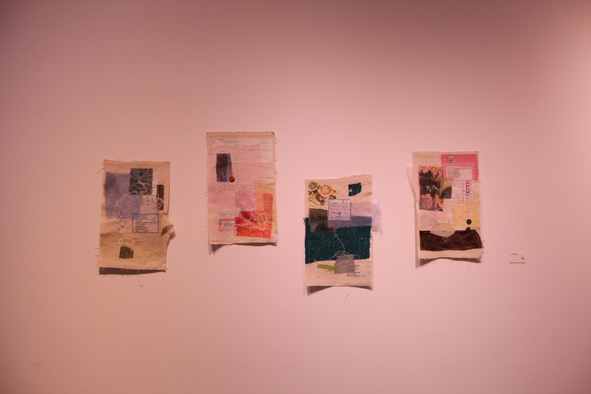 다효지(신지원)의 작업은 '행위적 아카이빙'의 전형이라 할 수 있다. 그는 할머니로부터 물려받은 낡은 한복과 천 조각을 바느질하며, 반복적인 행위 속에서 애도의 정서를 물질로 직조한다. 기도문을 써내려가고 손편지를 인쇄하며, 그것을 다시 천 위에 바느질하는 과정은 단순한 제작을 넘어 몸을 통한 기록이자 감각의 호출로 기능한다. 이때 바느질의 리듬은 애도의 언어가 되고, 그 감각은 다시 시가 되어 관람자의 정서적 층위에 닿는다.