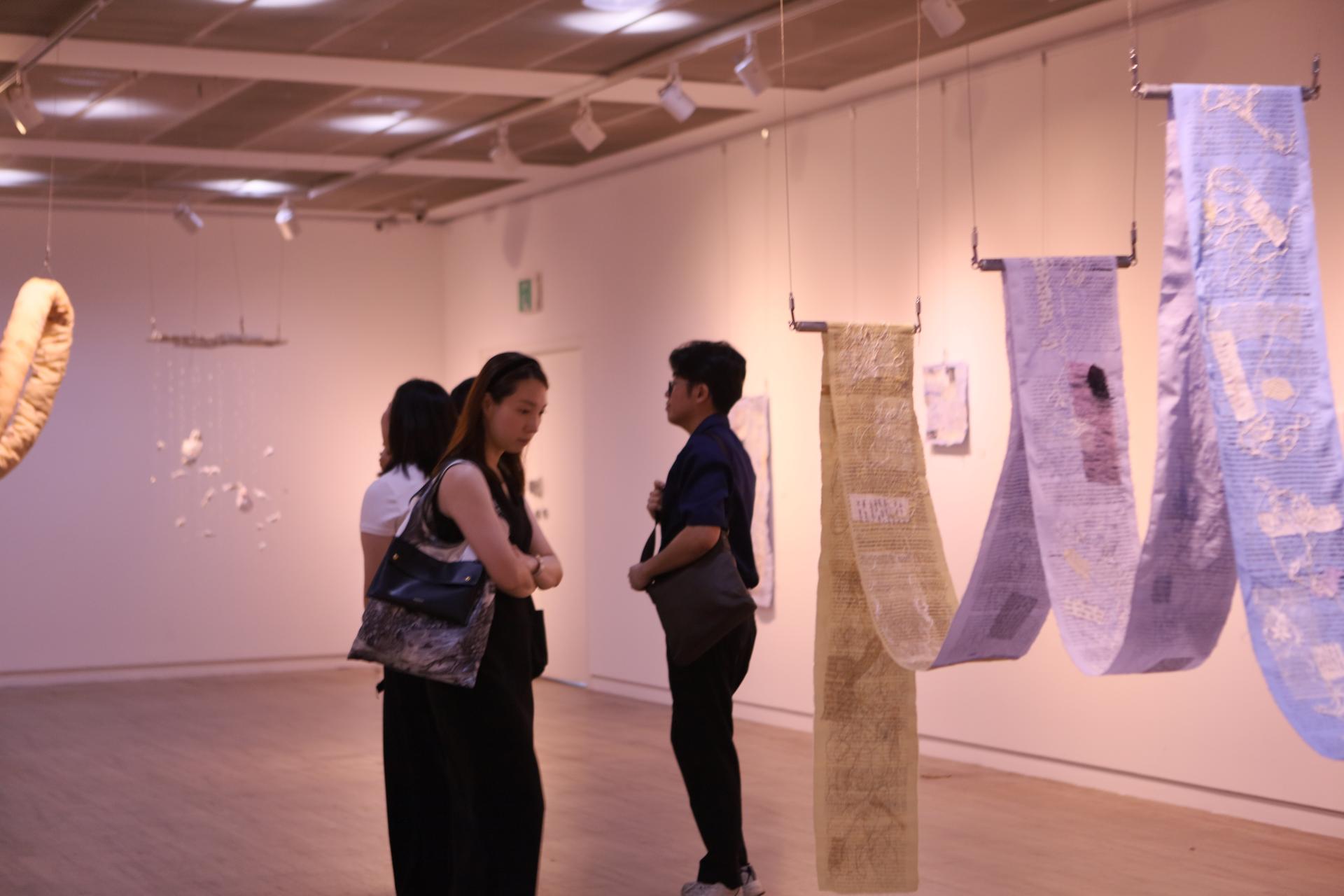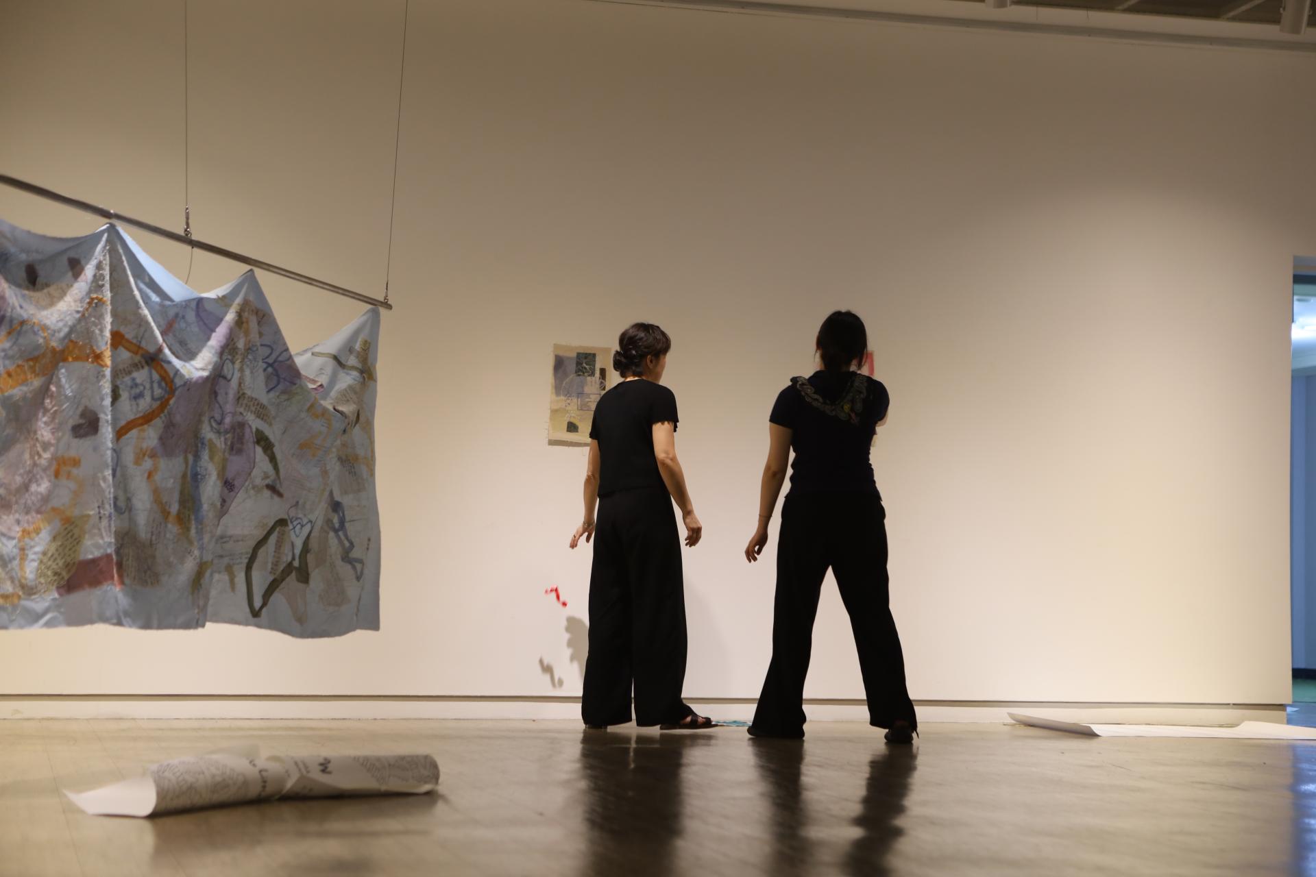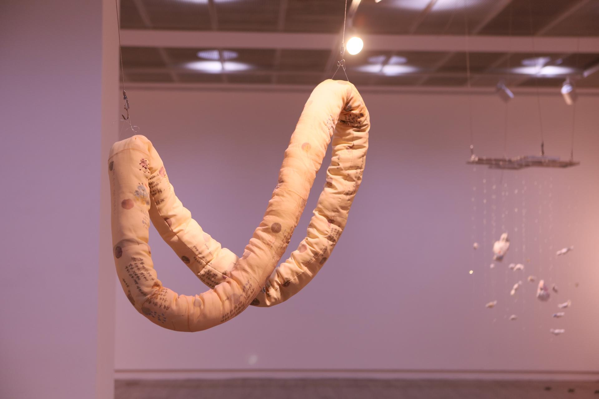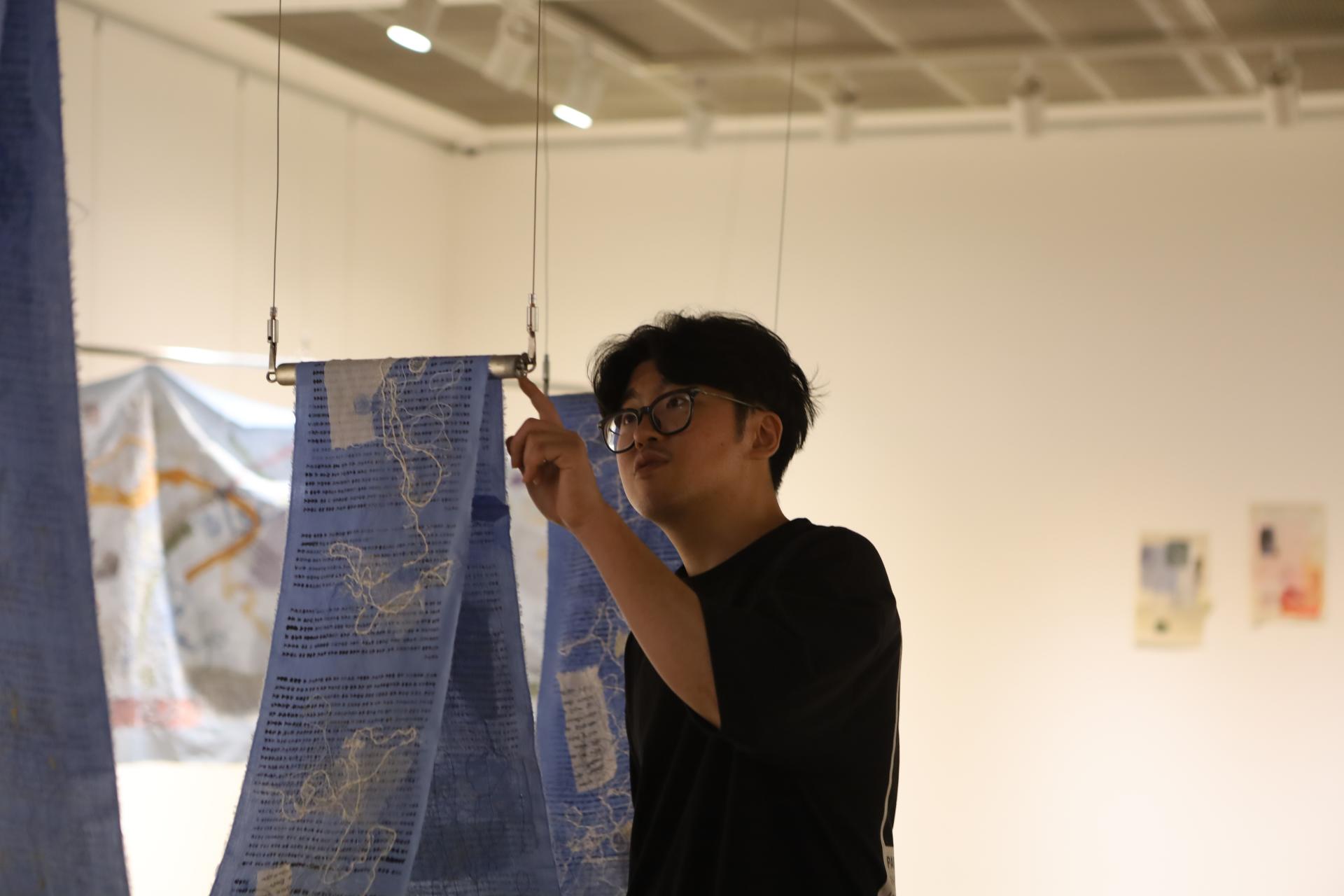 다효지(신지원)의 작업은 '행위적 아카이빙'의 전형이라 할 수 있다. 그는 할머니로부터 물려받은 낡은 한복과 천 조각을 바느질하며, 반복적인 행위 속에서 애도의 정서를 물질로 직조한다. 기도문을 써내려가고 손편지를 인쇄하며, 그것을 다시 천 위에 바느질하는 과정은 단순한 제작을 넘어 몸을 통한 기록이자 감각의 호출로 기능한다. 이때 바느질의 리듬은 애도의 언어가 되고, 그 감각은 다시 시가 되어 관람자의 정서적 층위에 닿는다.