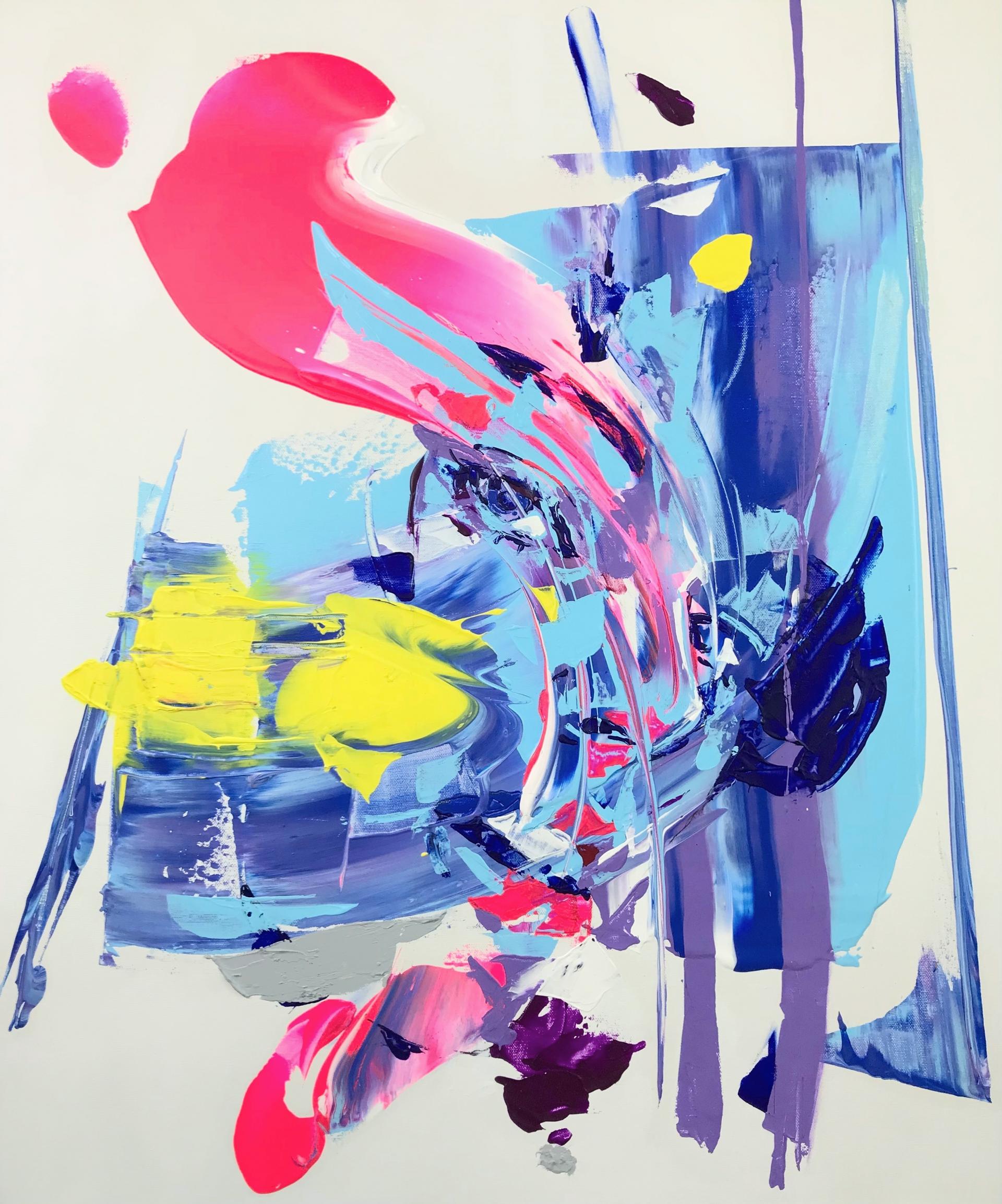 작품 속 분홍, 노랑, 파랑 등의 색채는 각기 다른 성질과 에너지를 지닌 존재로 등장한다. 이들은 충돌하면서도 하나의 화면으로 조화롭게 얽혀 있으며, 마치 서로 다른 삶과 감정, 존재들이 공존하는 세계와 같다. 화면 상단에서 아래로 흐르는 대담한 분홍색의 브러시 스트로크는 감정의 분출이자 내면의 본능적인 힘을 상징한다. 그 주변을 감싸는 파랑과 보라의 색채는 이를 안정시키거나 혹은 대립하는 감정의 잔상을 떠올리게 하며, 노랑의 돌발적 등장 역시 감정의 전환점이나 일종의 사건으로 읽힌다.